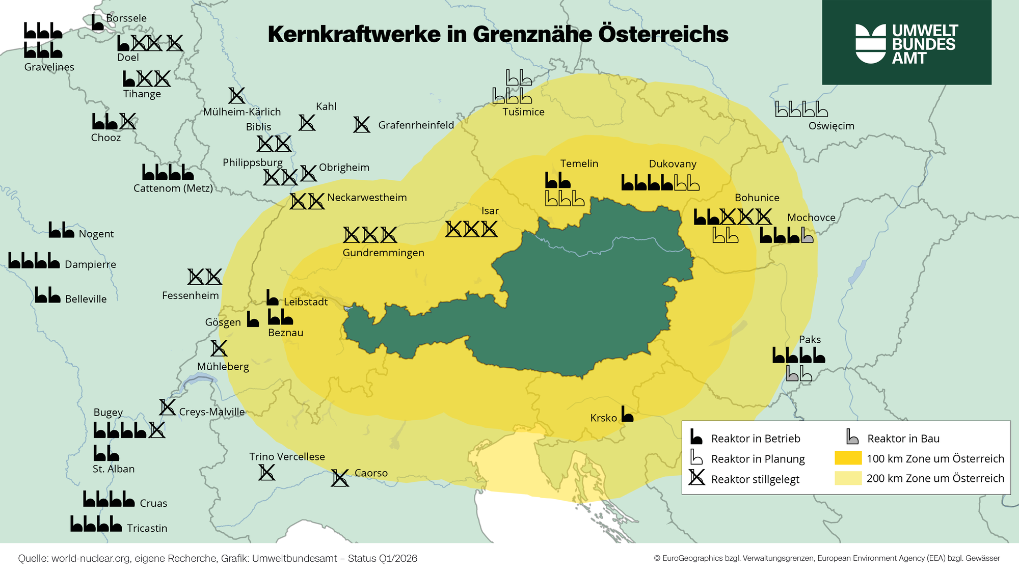 Abhängig vom Inventar und denkbaren Stör- bzw. Unfallbedingungen können entsprechende Anlagen auch in größerer räumlicher Distanz ein Risiko für Österreich darstellen. Das Bundesministerium für Land- und Forstwirtschaft, Klima- und Umweltschutz, Regionen und Wasserwirtschaft (BMLUK) beteiligt sich, namens der Republik Österreich, seit vielen Jahren an entsprechenden Bewilligungsverfahren, insbesondere UVP- und SUP-Verfahren, um der österreichischen Bevölkerung den Zugang zu den verfahrensrelevanten Unterlagen zu ermöglichen, als auch die Möglichkeit zur Stellungnahme sicherzustellen.