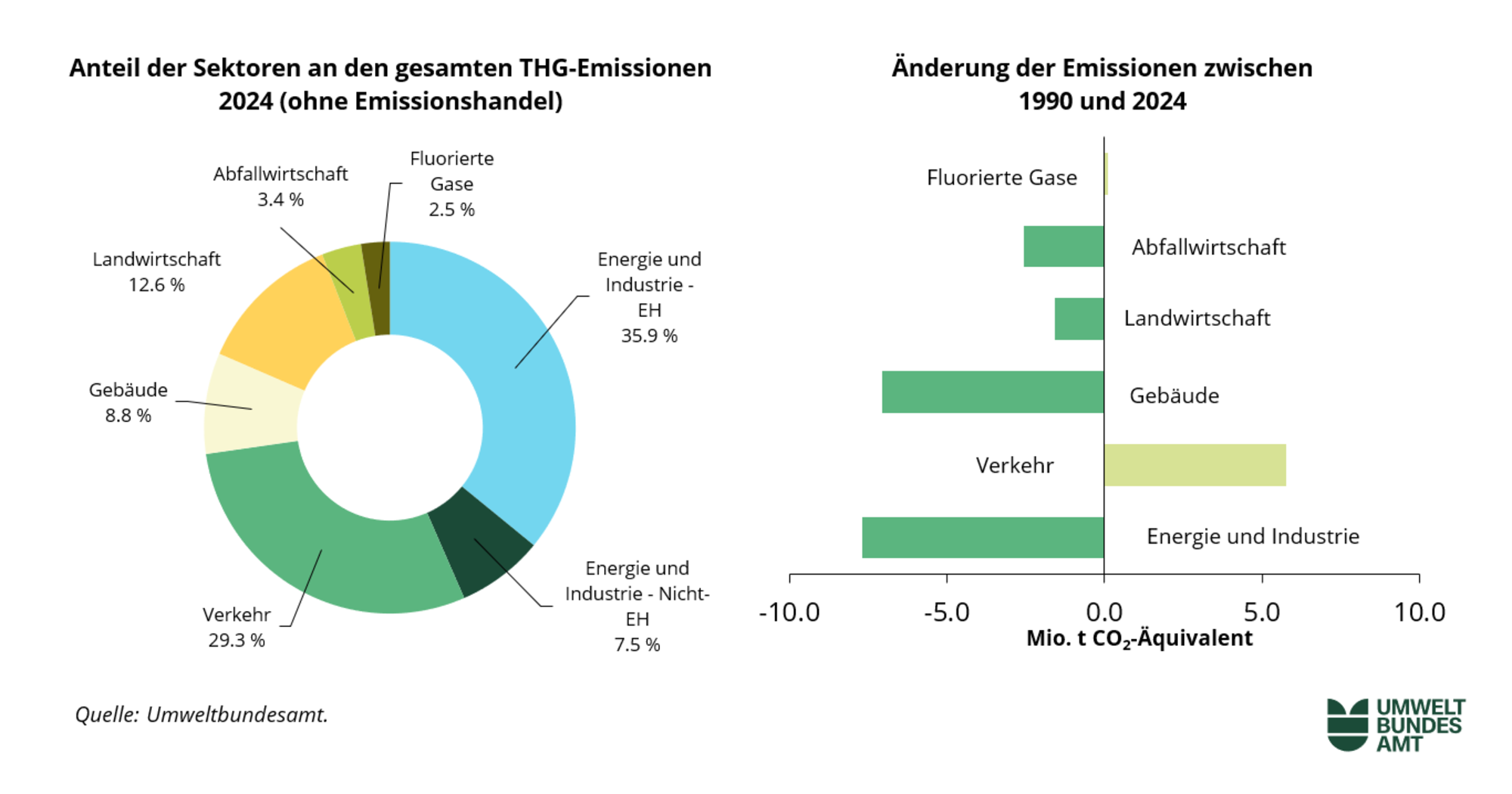 Die Gesamtemissionen des Sektors Energie und Industrie beliefen sich 2024 auf 29,0 Mio. Tonnen CO2-Äquivalent, jene des Verkehrs auf 19,5 Mio. Tonnen CO2-Äquivalent. Die Landwirtschaft verursachte 8,4 Mio. Tonnen CO2-Äquivalent, der Gebäudesektor 5,8 Mio. Tonnen CO2-Äquivalent, die Abfallwirtschaft 2,3 Mio. Tonnen CO2-Äquivalent und die Fluorierten Gase 1,7 Mio. Tonnen CO2-Äquivalent.