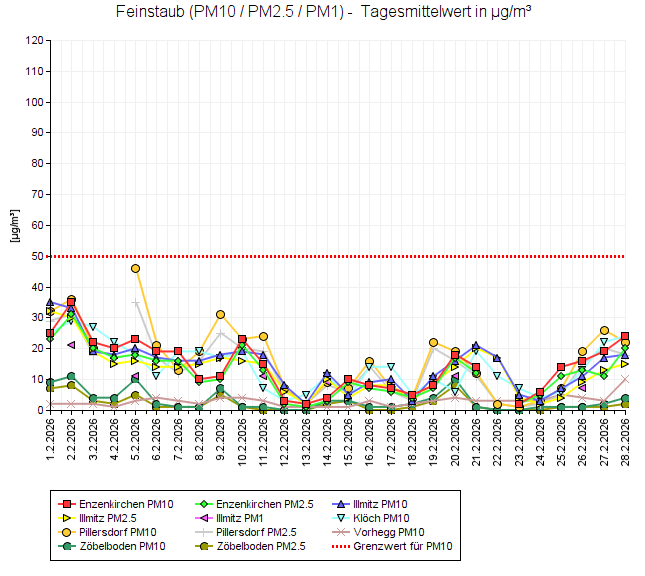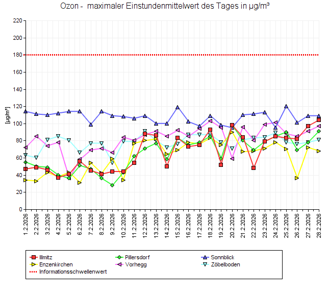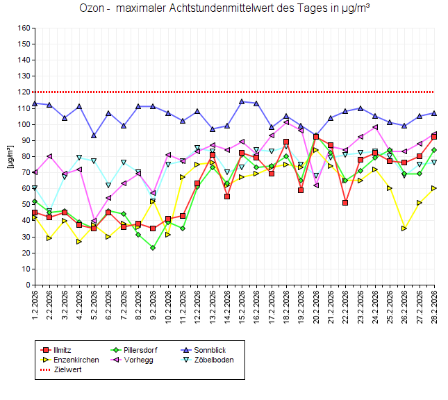Bei NO2 und PM10 registrierten alle Messstellen außer Vorhegg durchschnittliche Belastungen; in Vorhegg lagen die Konzentrationen deutlich unter dem Niveau der letzten Jahre, hier wurde der niedrigste PM10-Monatsmittelwert im Februar seit Beginn der Messungen registriert.