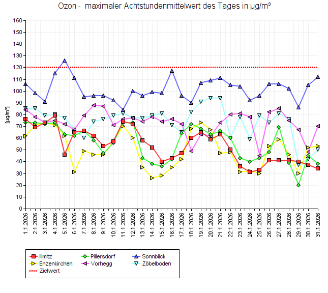 Die Ozonkonzentrationen lagen im Tiefland und im Mittelgebirge auf durchschnittlichem Niveau. Auf dem Sonnblick wurde dagegen der höchste Monatsmittelwert im Jänner seit Beginn der Messungen (1989) registriert.
