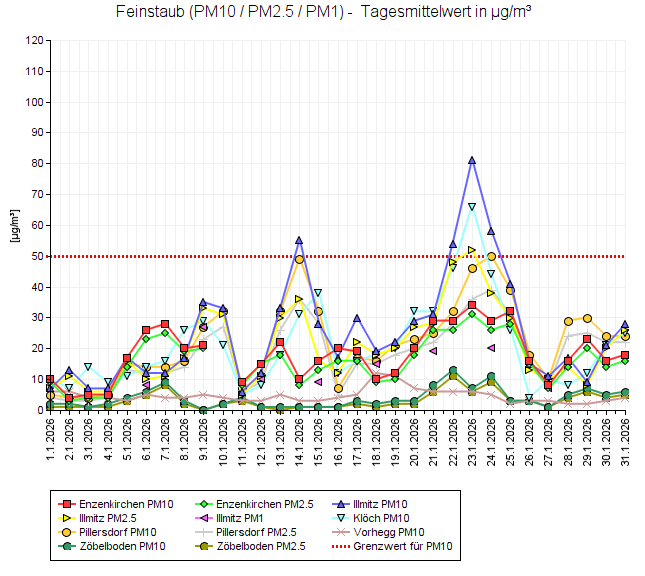 In Illmitz wurden vier Tagesmittelwerte über 50 µg/m³ beobachtet (14.1. sowie 22. – 24.1.), in Klöch ein Tagesmittelwert über 50 µg/m³ (23.1.). Die erhöhten PM10-Belastungen gingen auf wesentliche Beiträge von Ferntransport (14.1. von Osten, 22. und 23.1. von Südosten, 24.1. von Norden) zurück.
