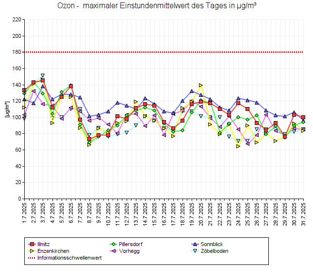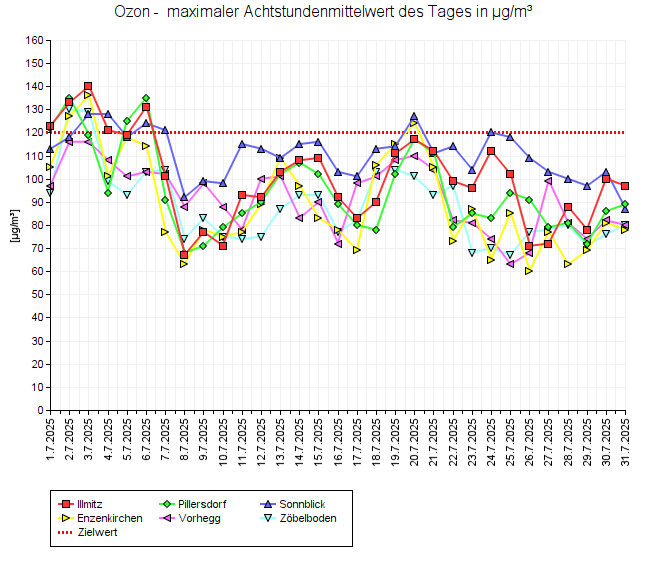 Die Ozonkonzentrationen lagen auf dem Sonnblick und in Vorhegg auf durchschnittlichem Niveau, an allen anderen Messstellen deutlich darunter. Die Informationsschwelle für Ozon wurde im Juli 2025 nicht überschritten.