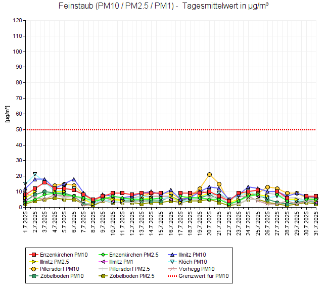 Die PM10-Konzentrationen lagen an allen Messstellen deutlich unter dem Niveau der letzten Jahre. Die Messstellen Illmitz, Pillersdorf, Vorhegg und Zöbelboden registrierten den niedrigsten Monatsmittelwert im Juli seit Beginn der Messungen (2000), Klöch den niedrigsten Monatsmittelwert der gesamten Messreihe.
