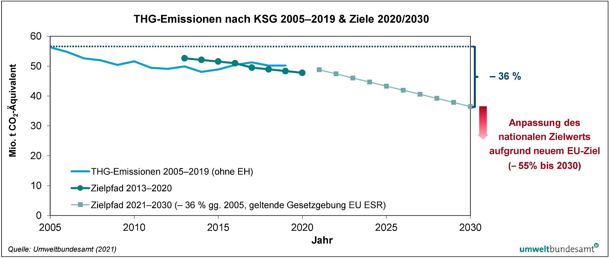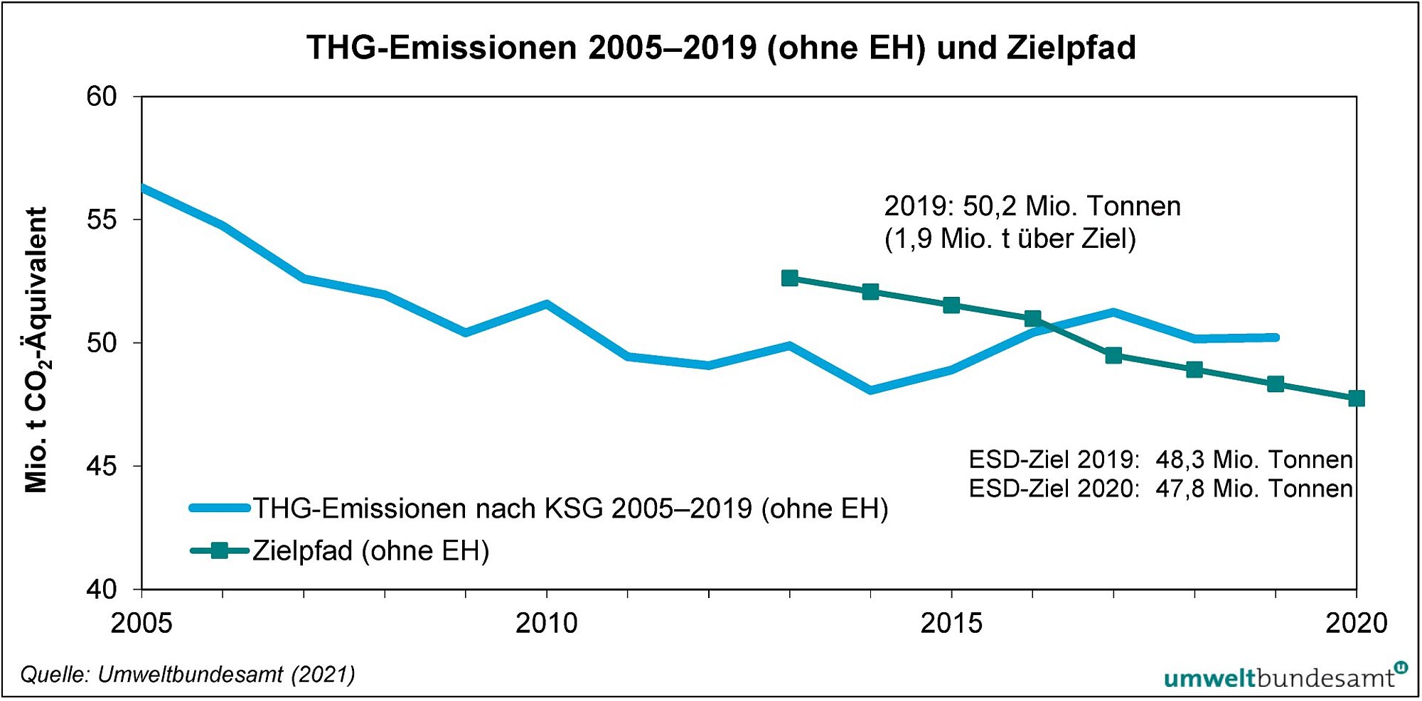 Für die Jahre 2013 bis 2020 gelten in Österreich jährliche Höchstmengen für die Freisetzung von Treibhausgasen aus Verkehr, Gebäude, Landwirtschaft, Abfallwirtschaft und allen weiteren Quellen, die nicht im Emissionshandel geregelt sind. Das nationale Ziel für 2019 wurde laut aktueller Treibhausgas-Bilanz nicht erreicht. Die tatsächlichen Emissionen dieser Sektoren liegen bei rund 50,2 Mio. Tonnen und damit um rund 1,9 Mio. Tonnen über dem für 2019 gültigen Zielwert von 48,3 Mio. Tonnen. Österreich stehen in Summe noch Gutschriften in der Höhe von rund 3,6 Mio. Tonnen zur Verfügung, die in die Zielerreichung 2020 eingerechnet werden.
