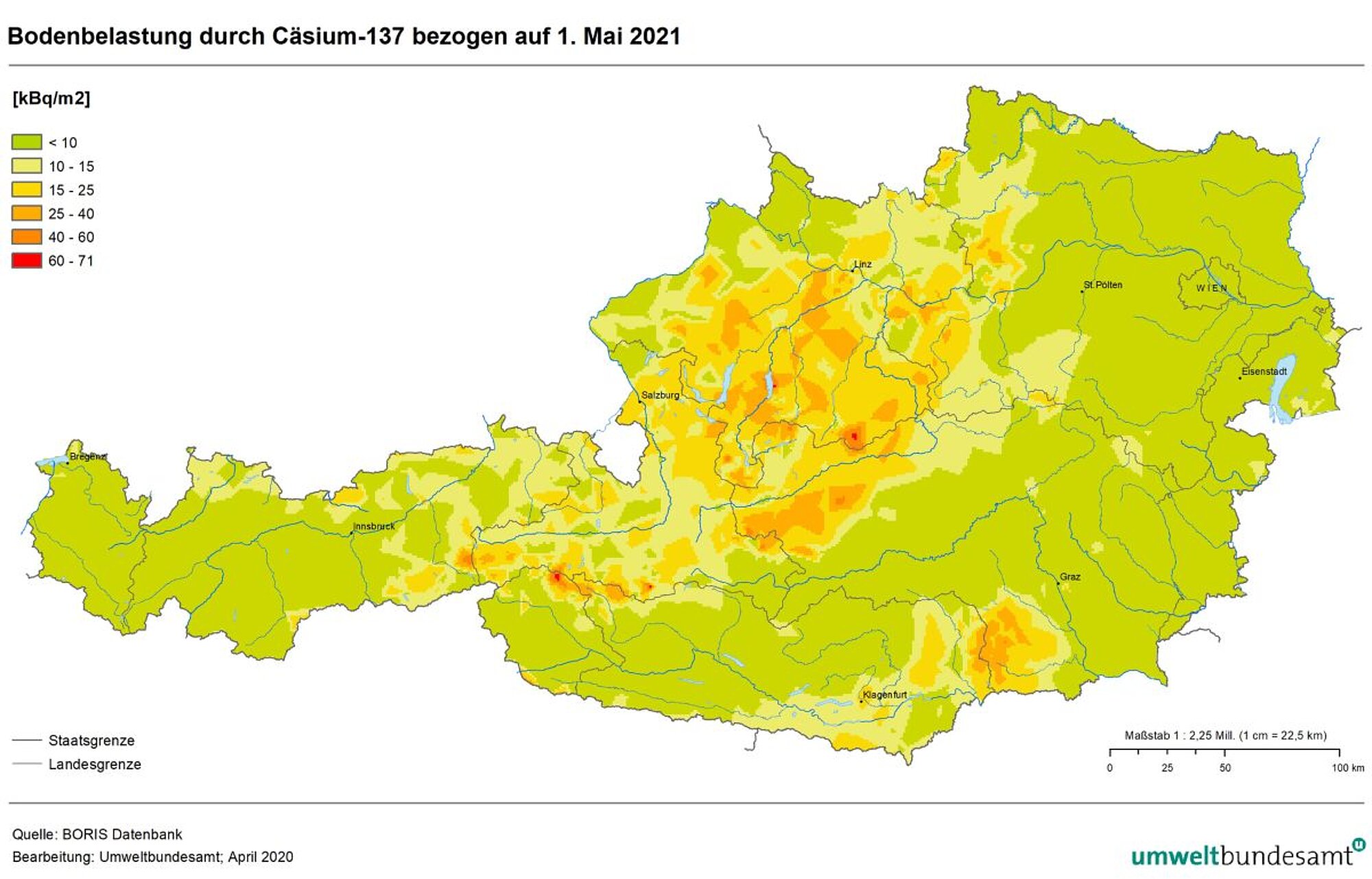 Wie stark die Böden in Österreich heute noch mit radioaktivem Cäsium-137 belastet sind, zeigt die aktualisierte Karte des Umweltbundesamtes. Cäsium-137 ist mit einer Halbwertszeit von ca. 30 Jahren ein wichtiger Indikator für die langfristige Belastung der Umwelt. Die höchsten Cäsium-137 Werte verzeichnen Gebiete in Oberösterreich, Kärnten Salzburg und der Steiermark. Die regionalen Unterschiede sind auf die Niederschlagsmengen in den Tagen nach dem Reaktorunfall zurückzuführen.