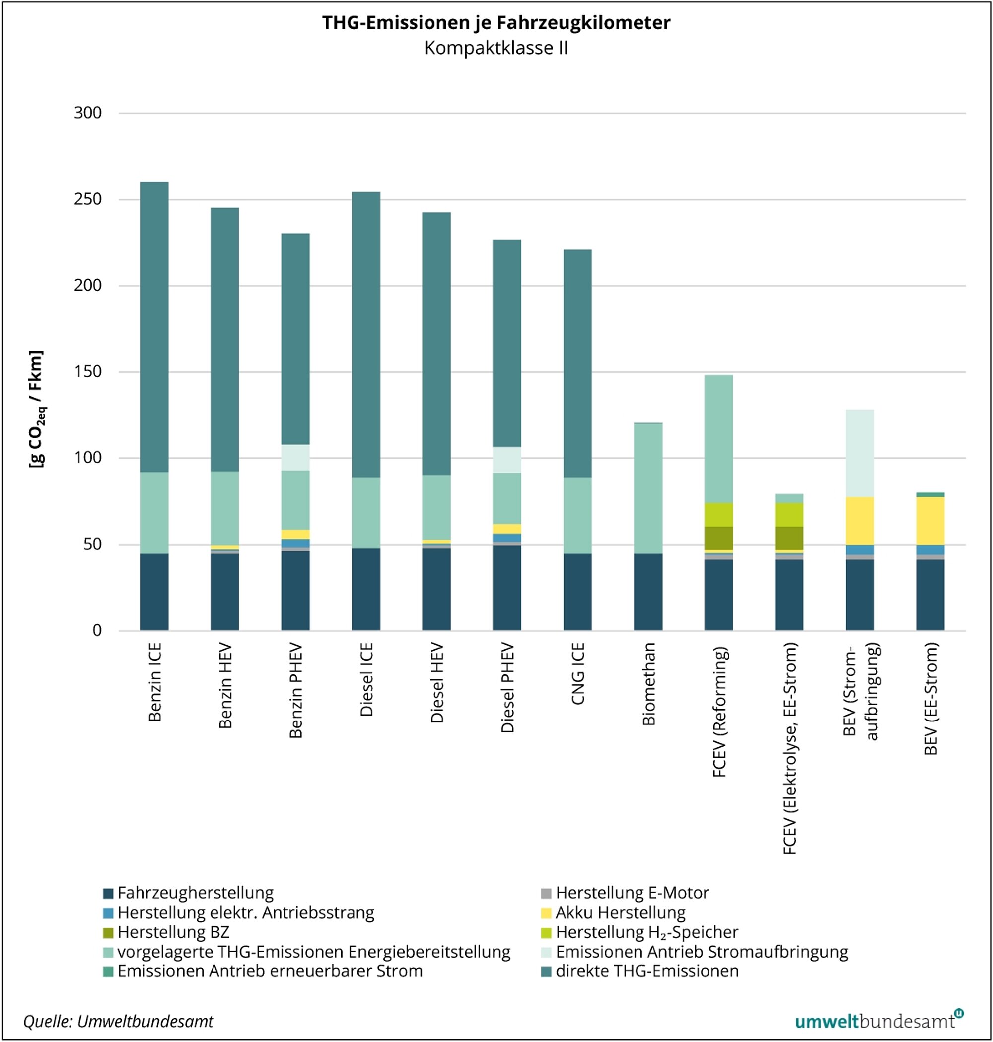 Im Umweltbundesamt-Vergleich stehen 39 unterschiedliche Fahrzeug- und Technologiekombinationen in den Kategorien Kleinwagen, Kompaktklasse und Oberklasse. Die Ergebnisse zeigen, dass Elektroautos (Battery Electric Vehicle, BEV) in der Ökobilanz in allen Kategorien die Nase vorn haben, vor allem wenn der Strom aus erneuerbaren Energieträgern stammt. Dann verursachen sie bis zu 79 % weniger Treibhausgas-Emissionen als konventionelle Pkw mit Verbrennungsmotor (Internal Combustion Engine, ICE). Hybrid-Fahrzeuge (Hybrid Electric Vehicle, HEV; Plug-In Hybrid Electric Vehicle, PHEV) verbessern die Ökobilanz von PKWs nur leicht. Wasserstoffautos (Fuel Cell Electric Vehicle, FCEV) schneiden zwar beim Vergleich der Emissionen ähnlich gut ab wie Elektroautos, sind aber nicht so energieeffizient. Sie brauchen pro gefahrenem Kilometer, je nachdem ob es sich um einen Kleinwagen oder ein Oberklasse-Fahrzeug handelt, um rund 39–83 % mehr Energie als ein batteriebetriebenes Elektroauto. Die größten Hebel zur Vermeidung von Treibhausgas-Emissionen in der Fahrzeugproduktion liegen im Energiemix, der für die Herstellung eingesetzt wird, und in der Wiederverwertung von Rohstoffen beim Fahrzeugbau.