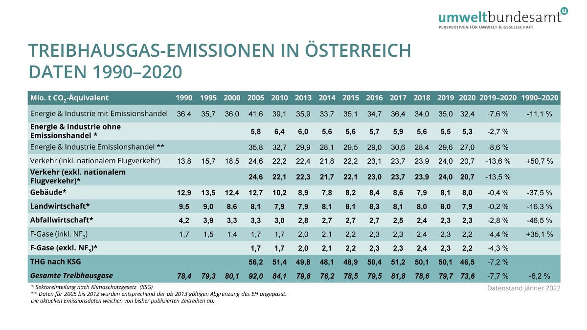 Die Sektoreinteilung folgt der des Klimaschutzgesetzes. Aufgrund der kontinuierlichen Verbesserung der Treibhausgas-Inventur, die jeweils die ganze Zeitreihe (Daten von 1990 bis 2020) betrifft, können die Emissionen von bisher publizierten Daten abweichen.