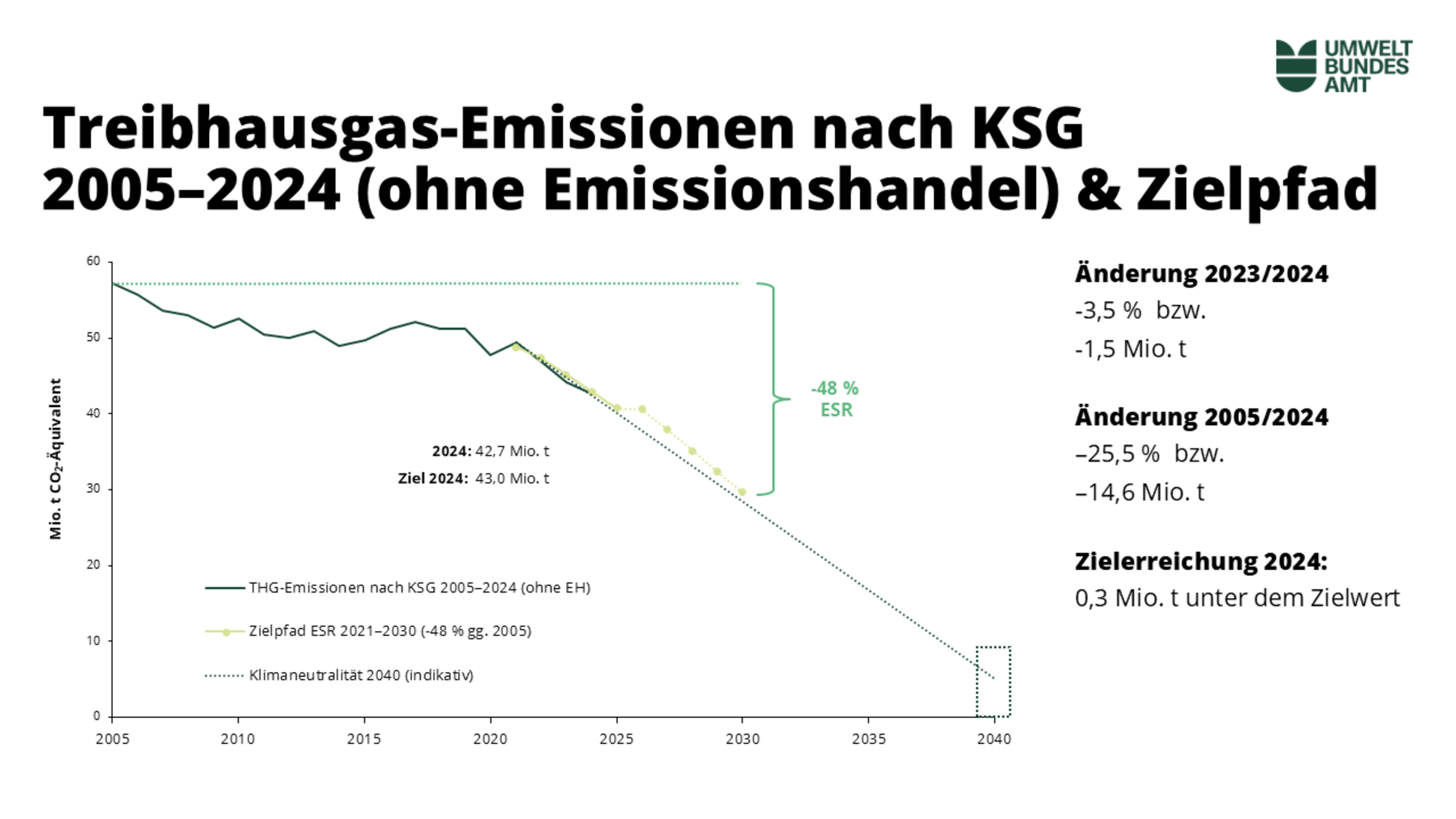 Treibhausgas-Emissionen nach KSG 2005–2024 (ohne Emissionshandel) & Zielpfad: Änderung 2023/2024 -3,5 %  bzw.  -1,5 Mio. t;  Änderung 2005/2024 –25,5 %  bzw.  –14,6 Mio. t;  Zielerreichung 2024: 0,3 Mio. t unter dem Zielwert
