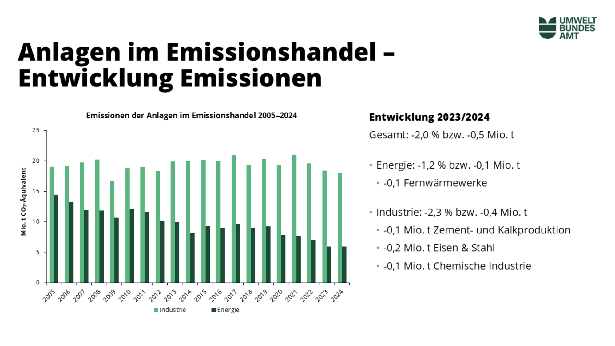 Anlagen im Emissionshandel: Entwicklung 2023/2024 Gesamt: -2,0 % bzw. -0,5 Mio. t  Energie: -1,2 % bzw. -0,1 Mio. t / -0,1  Fernwärmewerke  / Industrie: -2,3 % bzw. -0,4 Mio. t; -0,1 Mio. t Zement- und Kalkproduktion; -0,2 Mio. t  Eisen & Stahl;  -0,1 Mio. t Chemische Industrie