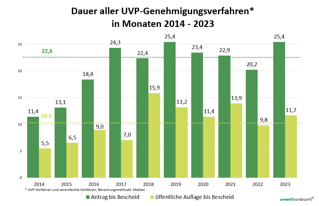 Die mittlere Verfahrensdauer aller UVP-Genehmigungsverfahren von 2015 bis 2024, mit Hilfe des Medians berechnet, liegt vom Einbringen des Genehmigungsantrages bis zur Entscheidung bei 22,6 Monaten. Von Beginn der öffentlichen Auflage (Vollständigkeit der Unterlagen) bis zur Entscheidung liegt sie bei 10,6 Monaten.